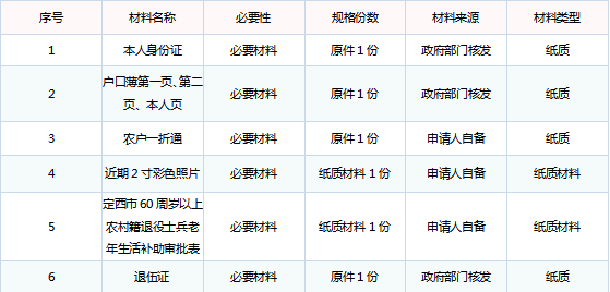 一、事项名称:60周岁及以上农村籍退役士兵老年生活补助的认定上报 二、申报材料: 三、受理条件:60周岁及以上农村籍退役士兵。 四、办理程序:1、由申报人员携带申报材料到便民服务中心申报办理;2、便民服务中心工作人员窗口审核,符合条件的予以当场受理。 五、办理流程: 六、设定依据:《退役士兵安置条例》。 七、收费标准:暂无 八、办理时限: 1、法定办结期限:1个工作日 2、承诺办结期限:1个工作日 九、办理形式: 1、窗口办理 办理地点:中寨镇政务服务中心 办理时间:周一至周五上午:8:30-12:00 下午2:30-6:00 2、网上办理 办理网址:甘肃政务服务网(http://www.gszwfw.gov.cn/) 办理时间:24小时办理 3、咨询电话:0932-7535242 |