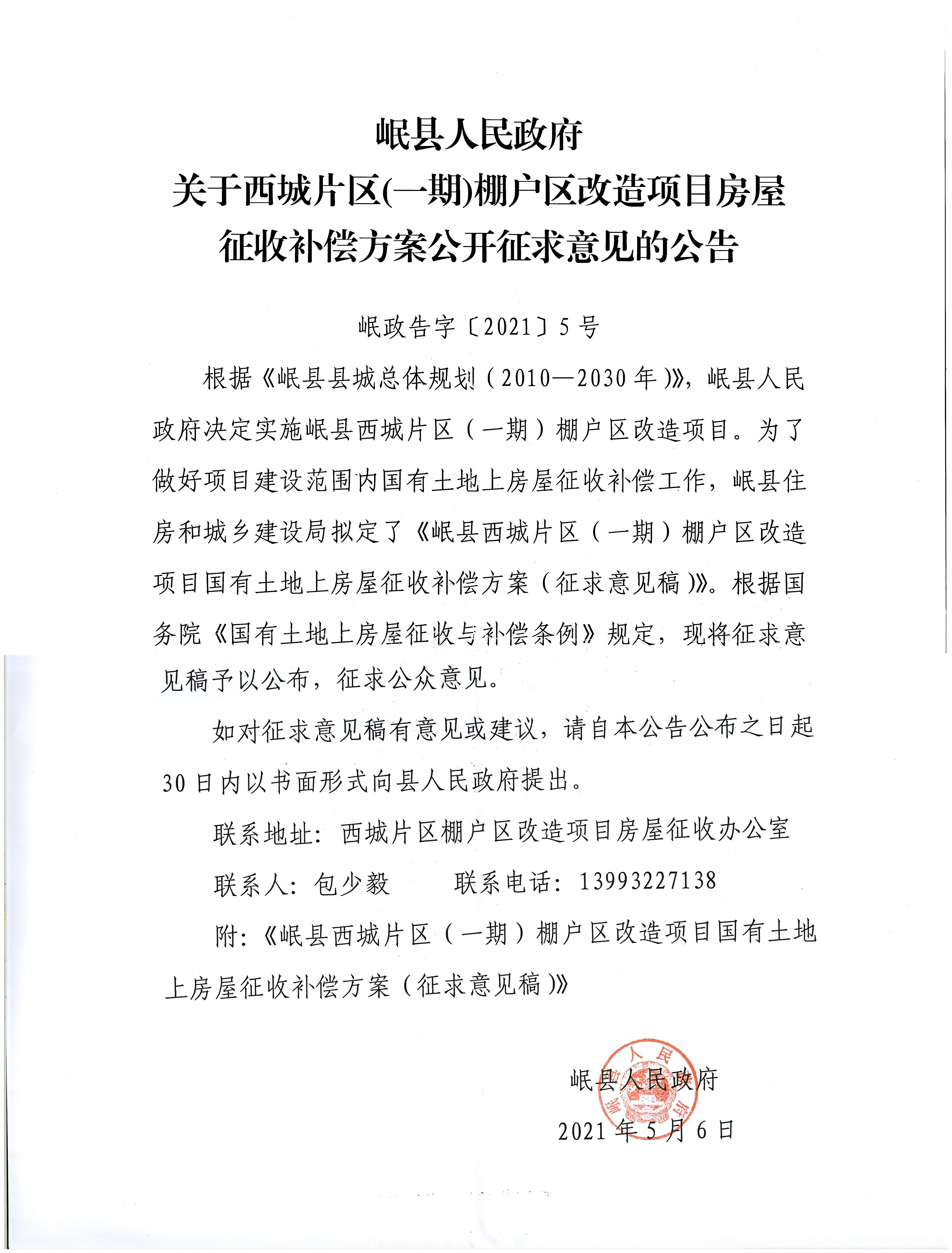 关于西城片区(一期)棚户区改造项目房屋征收补偿方案公开征求意见的公告 |