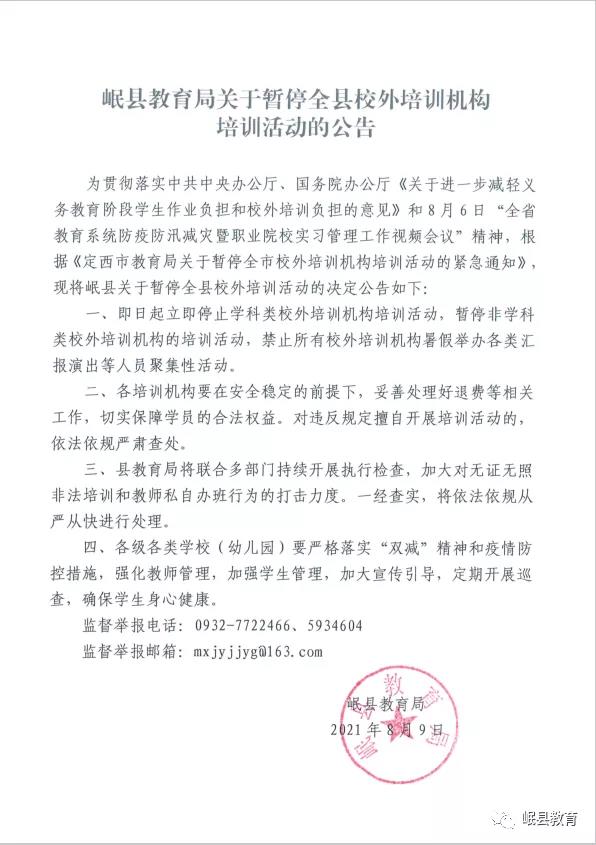 岷县教育局关于暂停全县校外培训机构培训活动的公告