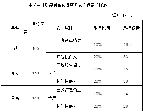 为促进脱贫攻坚与乡村振兴有效衔接,增强农业防灾减灾和农民抗风险能力,保障乡村产业发展,助推乡村全面振兴,加快农业农村现代化,根据《甘肃省农业农村厅甘肃省林业和草原局甘肃省财政厅关于下达2021年农业保险计划的通知》(甘农财发〔2021〕3号)和《定西市2021-2023年农业保险助推乡村振兴推进方案》(定市农发〔2021〕23号)精神,结合我县种养业实际,制定本方案。 一、指导思想 以习近平新时代中国特色社会主义思想为指导,全面贯彻党的十九大和十九届二中、三中、四中、五中全会精神,将农业保险作为巩固拓展脱贫攻坚成果、支持乡村全面振兴的重要举措,以推动农业产业发展和保障农户稳产增收为目标,紧紧围绕粮食、生猪等重要农产品和主导产业发展,坚持政府引导、市场运作、自主自愿、协同推进的基本原则,深入开展农业保险“增品、扩面、提标”工作,努力提高农业保险保障水平,推动农业保险高质量发展,为促进农业现代化和乡村全面振兴提供风险保障。 二、总体要求 农业保险在优先保障已脱贫建档立卡户、边缘易致贫户和脱贫不稳定户的基础上,不断加大对农业经营主体的保险供给,发挥农业经营主体的带动作用,提升全县农业产业应对自然灾害和市场风险的能力。优先将马铃薯等粮食作物和能繁母猪、育肥猪纳入保险,切实保障全县粮食安全和生猪等重要农产品有效供给水平。在充分尊重投保人自主自愿权利的前提下,有效满足投保人的保险需求,调动农户参保积极性。 三、任务指标 省上下达我县2021年农业保险任务指标分别为:中药材100000亩(其中:当归67700亩、党参14353亩、黄芪17947亩)、中蜂80000箱、猫尾草31519亩、马铃薯27733亩、牦牛55915头、藏系羊23663只、能繁母猪1873头、肉牛4934头、肉羊12778只、露地蔬菜5000亩、育肥猪3802头、鸡18190只、奶牛9头、公益林706706亩。(各乡镇具体分解指标详见附件)。 四、单位保额、费率、补贴比例、投保条件及保险责任 (一)马铃薯保险 马铃薯保险每亩保险金额700元,费率3%,单位保费21元。其中:中央财政补贴40%即8.4元,省财政补贴25%即5.25元,市县财政补贴15%即3.15元,农户自缴20%即4.2元。 马铃薯保险的参保对象为岷县范围内从事马铃薯种植的农户(场)、企业、农民专业合作社等。投保人必须将符合以下投保条件的马铃薯进行全部投保,不得选择性投保,投保条件如下: 1.符合当地农业技术部门规定标准,达到当地普遍采用的种植技术管理要求的马铃薯品种; 2.“高保额”标的为经过政府部门审定的二级以上脱毒马铃薯和采用黑膜覆盖技术种植的马铃薯品种; 3.种植场所在当地洪水水位线以上的非蓄洪区、行洪区; 4.生长正常,投保人应将其所有或管理的马铃薯全部投保,不得选择投保。 保险责任:在保险期间内,由于下列原因直接造成保险马铃薯的损失,保险人按照保险合同的约定负责赔偿:暴雨、洪水(政府行蓄洪除外)、内涝、风灾、雹灾、冻灾、旱灾、地震、泥石流、山体滑坡、病虫草鼠害。 (二)中药材产值保险 中药材每亩产值保险金额2800—3300元,费率5%,保费140—165元。其中:省级财政补贴40%,市县对已脱贫建档立卡户和其他投保人分别补贴50%、40%,已脱贫建档立卡户和其他投保人分别承担10%、20%(详情见下表)。 中药材产值保险的参保对象为岷县范围内从事中药材种植的农户(场)、企业、农民专业合作组织等,投保人必须将符合以下投保条件的中药材进行全部投保,不得选择性投保,投保条件如下: 1.单一品种连片种植亩数在30亩以上、技术标准化、管理规范化的农户、龙头企业、专业合作社,可单独进行投保或组织进行集体投保; 2.对单一品种连片种植亩数小于30亩的散户,由村民委员会组织集体投保; 3.单独投保和集体投保的都应向保险公司提供详细的种植信息和分户清单。 保险责任:在保险期间内,由于下列原因造成保险中药材的损失,保险人按照保险合同的约定负责赔偿:火灾、爆炸、暴雨、洪水(政府行蓄洪除外)、风灾、雷电、冰雹、冻灾、寒潮、泥石流、山体滑坡、建筑物倒塌、空中运行物体坠落。 (三)中华蜂保险 中华蜂实行成本保险,单位保费40元。其中:市级对已脱贫建档立卡户补贴40%,县级补贴50%;已脱贫建档立卡户自缴10%即4元,其他投保人市级补贴30%,县级补贴50%,自缴20%即8元。 (四)猫尾草 猫尾草实行成本保险,单位保费9元。其中:市级对已脱贫建档立卡户补贴40%,县级补贴50%;已脱贫建档立卡户自缴10%即0.9元,其他投保人市级补贴30%,县级补贴50%,自缴20%即1.8元。 (五)牦牛保险 牦牛保险金额3000元,费率5%,保费150元。其中:中央财政补贴40%即60元,省财政补贴30%即45元,市县财政补贴20%即30元,农户自缴10%即15元。 牦牛保险投保对象为在岷县范围内从事牦牛养殖的农户(场)、企业、合作社等个人或组织,投保人必须将符合以下投保条件的牦牛进行全部投保,不得选择性投保,投保条件如下: 体重80公斤以上(含),畜龄在1周岁以上(含)7周岁以下(不含),投保牦牛经畜牧兽医部门验明无伤残,投保时无本保险责任范围内的疾病,饲养管理正常,已按县畜牧兽医部门审定的免疫程序接种并有记录。 保险责任:在保险期间内,由于下列原因直接造成保险牦牛死亡,保险人按照保险合同的约定负责赔偿:口蹄疫、炭疽、牛出血性败血症、布氏杆菌病、牛结核病、牛传染性鼻气管炎、牛焦虫病、牛恶性