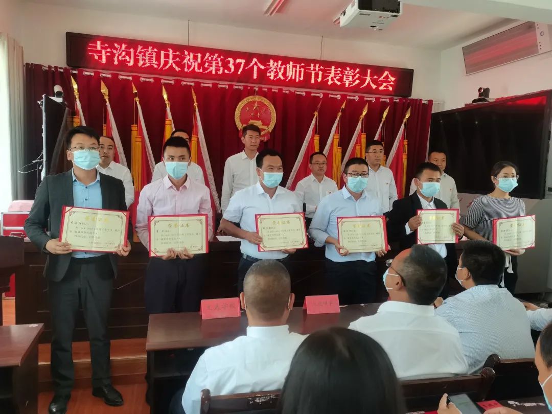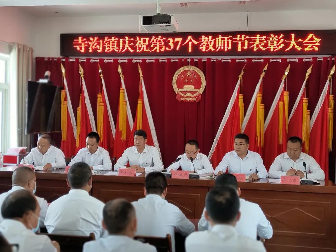为弘扬高尚师德,潜心立德树人。9月9日,寺沟镇召开庆祝第37个教师节表彰大会,对2020-2021年度在寺沟镇教育工作上涌现出的先进个人进行表彰奖励。寺沟镇党委、政府领导班子成员,学区、中小学教职工共计110余人参加。会议由镇党委副书记、镇长何永恩同志主持。 活动在庄严的国歌声中拉开帷幕。会上,学区校长周晖同志通报上年度教育工作并安排部署本年度教育工作。副镇长后卫东同志宣读了《关于表彰优秀教师、优秀班主任、优秀教育工作者及脱贫攻坚先进个人的决定》。 十年树木,百年树人。优秀教师代表李玉兰在发言中,以“感谢”“责任”“学习”三个词总结了教学工作中的点点滴滴,她说:“恪守职业道德,情操高尚,表里如一是我的人生信条。作为一名教师,我们的身上承载着万千家庭的希望和梦想,责任是重大的,不敢有半点懈怠。” 会上,镇党委书记何元忠代表镇党委、政府向全镇教育工作者致以节日的祝福和问候,希望全镇广大干部群众和教育系统广大教职员工要以先进为榜样,赶先进、做先进,努力创造一流工作业绩,为推动全镇教育事业持续健康发展、推动乡村振兴做出新的更大的贡献。希望受到表彰的先进个人珍惜荣誉、戒骄戒躁、百尺竿头更进一步,为全镇教育事业的发展再创佳绩、再立新功。 会议要求:一要精心组织,深刻领会精神实质。各学校要及时组织召开专题会议,认真学习讲话精神,深刻领会新学年教育工作的工作思路和主要目标,全面推进精细化管理,规范学校办学行为,提升管理水平和办学品位。二要团结协作,凝聚教育发展合力。各学校要进一步深化对教育优先发展的认识,积极主动的关心和参与教育事业,引导和动员社会各方面力量参与教育事业发展,努力形成全社会关心教育、支持教育、发展教育的良好氛围。三要突出重点,全面推进教学任务。各学校要根据教学目标责任书,进一步分解工作任务,合理分工,具体到人,确保巩固拓展脱贫攻坚成果同乡村振兴有效衔接各项教育政策落实落细落好。 在本次大会中,全镇共表彰优秀教师54名、优秀班主任32名、优秀教育工作者15名、脱贫攻坚先进个人9名。