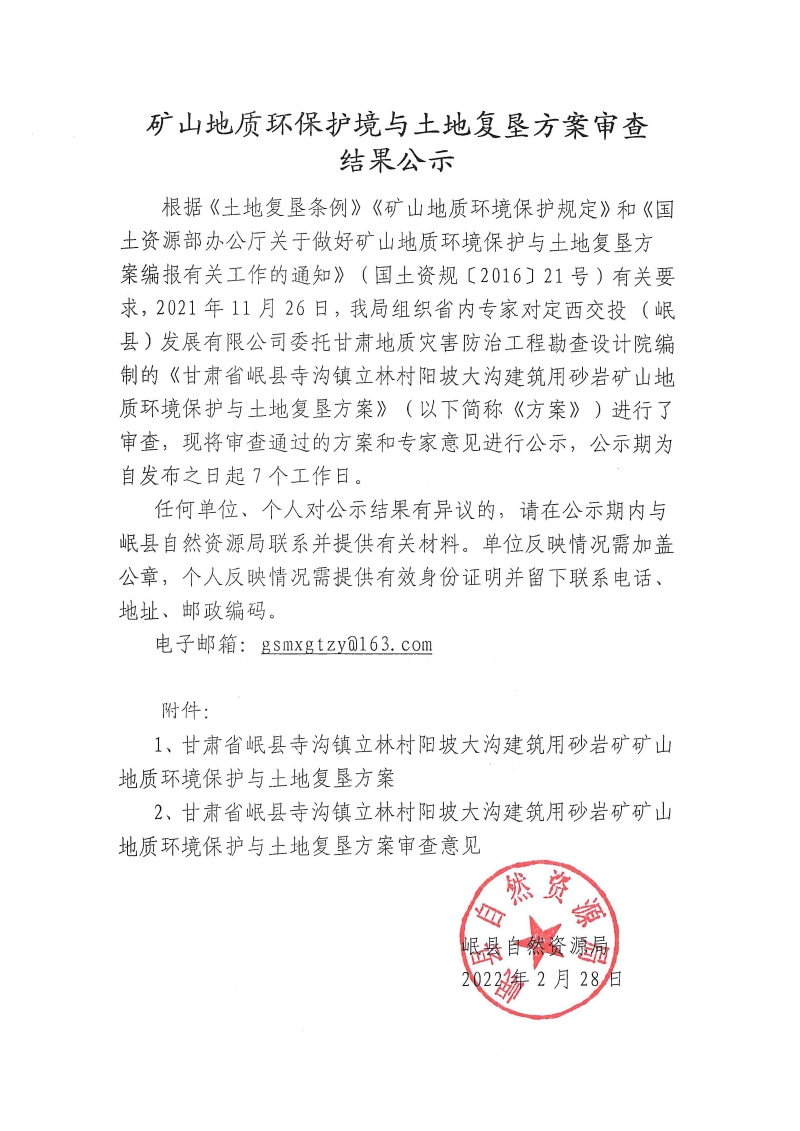 岷县寺沟镇阳坡大沟建筑用砂岩矿矿山地质环境保护与土地复垦方案公示