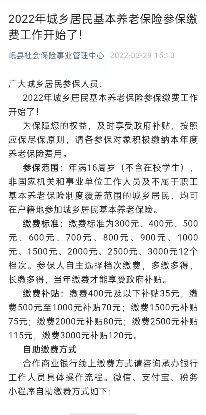 2022年城乡居民基本养老保险参保缴费工作开始了!