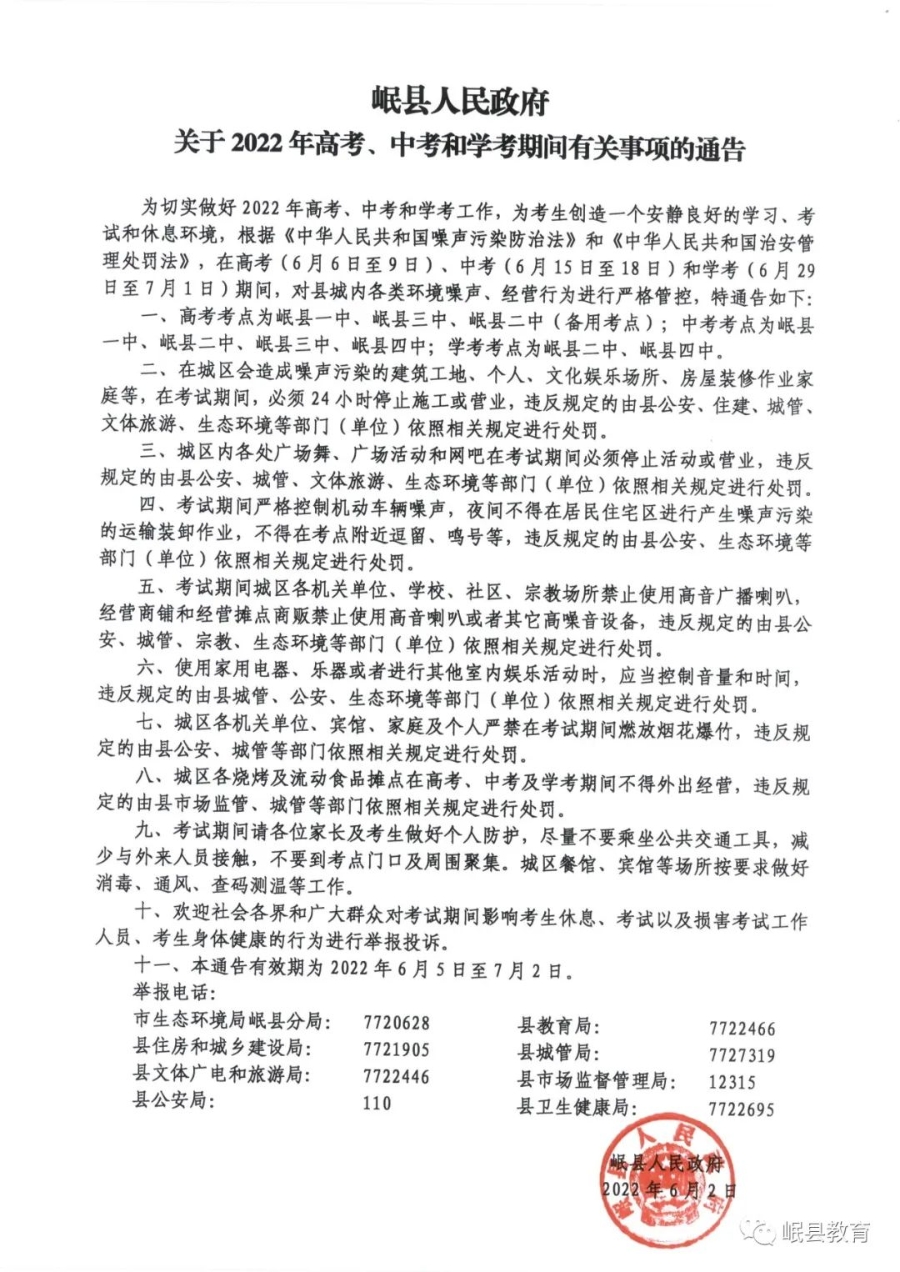 岷县人民政府关于2022年高考、中考和学考期间有关事项的通告 |