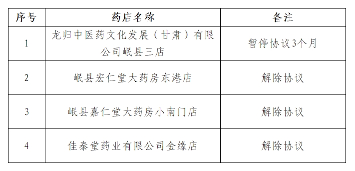 为进一步加强我县定点医药机构管理,规范定点药店医保服务行为,维护医保基金安全运行,根据《医疗保障基金使用监督管理条例》《零售药店医疗保障定点管理暂行办法》等有关规定和《定西市医疗保障定点零售药店服务协议》约定,对近期解除及暂停的4家定点药店名单公示如下: