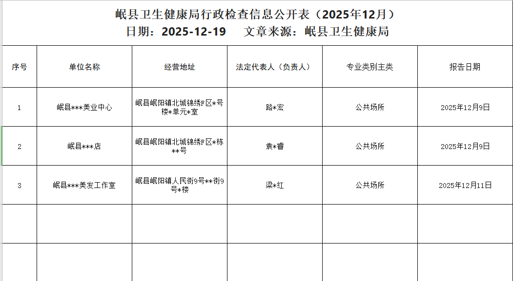 岷县卫生健康局行政检查信息公开表(2025年12月)