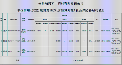 2.单位招用(安置)脱贫劳动力(含监测对象)社会保险:按照“招用脱贫劳动力(含监测对象)签订1年以上劳动合同并缴纳社会保险费的在甘企业,可向脱贫劳动力户籍县提出申请,按照其为招用就业困难人员实际缴纳的基本养老保险费、基本医疗保险费和失业保险费给予补贴,不包括就业困难人员个人应缴纳的部分。补贴期限除对距法定退休年龄不足5年的就业困难人员可延长至退休外,其余人员最长不超过3年(以初次核定其享受社会保险补贴时年龄为准),对超过社保缴费基数100%部分不予补贴”等内容要求,拟补贴岷县顺兴和中药材有限责任公司吸纳的3名脱贫劳动力(含监测对象)社会保险费共计5.324928万元。
