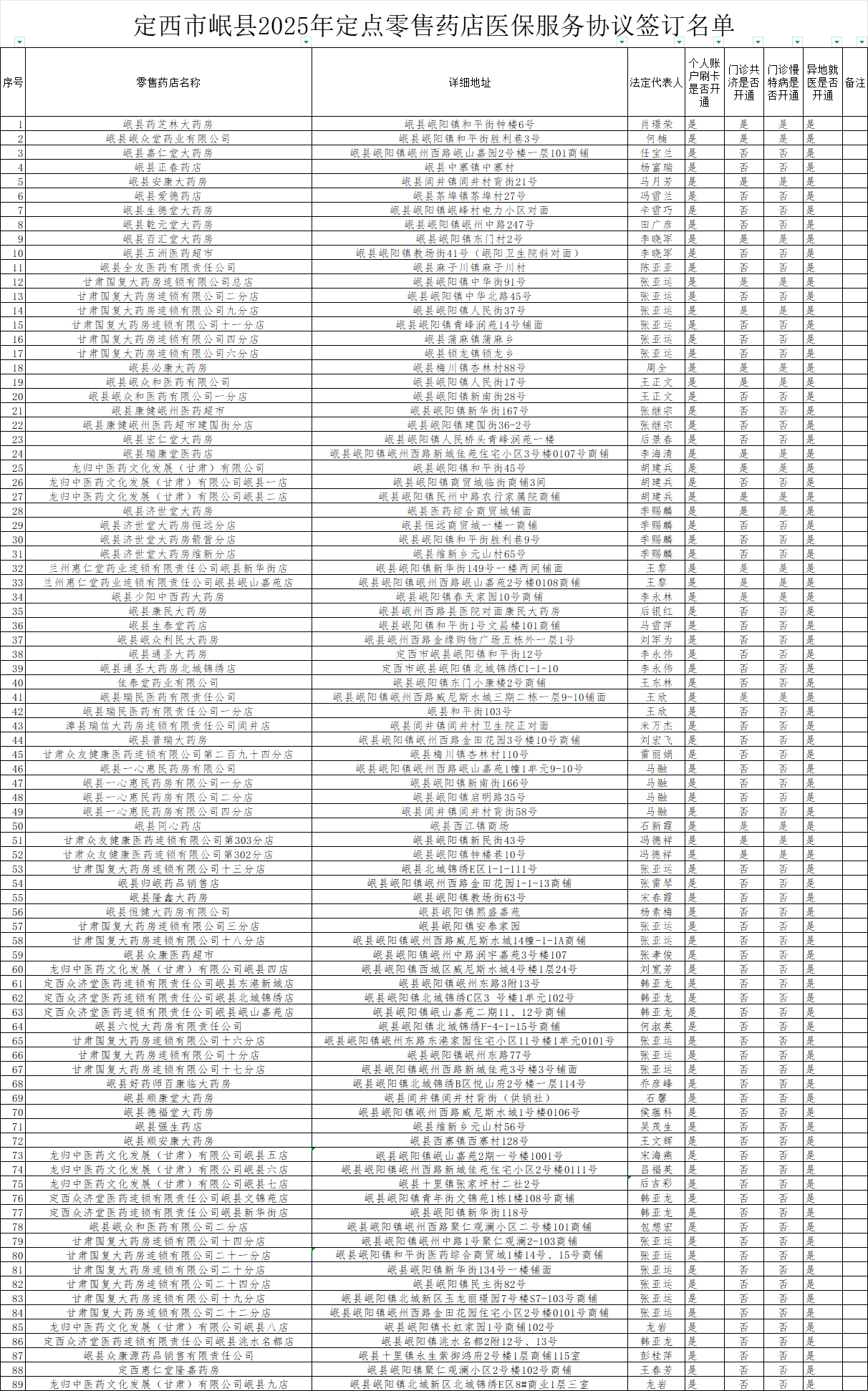 为进一步规范定点医疗机构医保服务行为,提高医疗保障基金使用效率,保障参保人员合法权益,根据《定西市定点零售药店医疗保障服务协议》的有关规定,岷县医保局组织各定点零售药店于2025年1月23日完成协议签订,现公示如下: