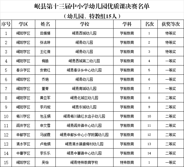 各学区、中学、城区各学校(幼儿园): 根据岷县教育局《关于印发<岷县第十三届中小学幼儿园优质课决赛实施方案>的通知》(岷教发[2025]47号)要求,3月17日——19日,岷县第十三届中小学幼儿园优质课决赛活动顺利完成,现将决赛结果予以公示。 公示时间为2025年3月21日至3月25日,共3个工作日(不含双休日)。如有异议,可在公示期内向教育局实名反映,逾期不予受理。 受理电话: 0932-5934613 0932-7722466 附件:岷县第十三届中小学幼儿园优质课决赛结果名单