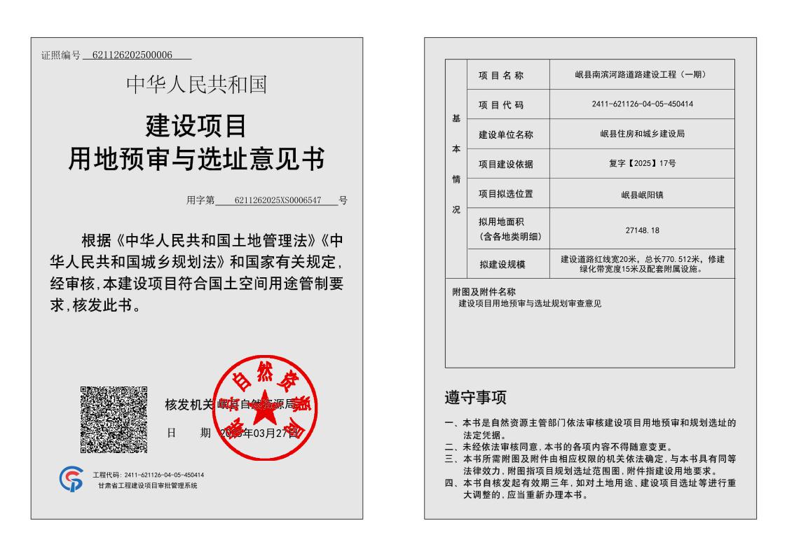 岷县南滨河路道路建设工程(一期)建设项目用地预审与选址意见书公示