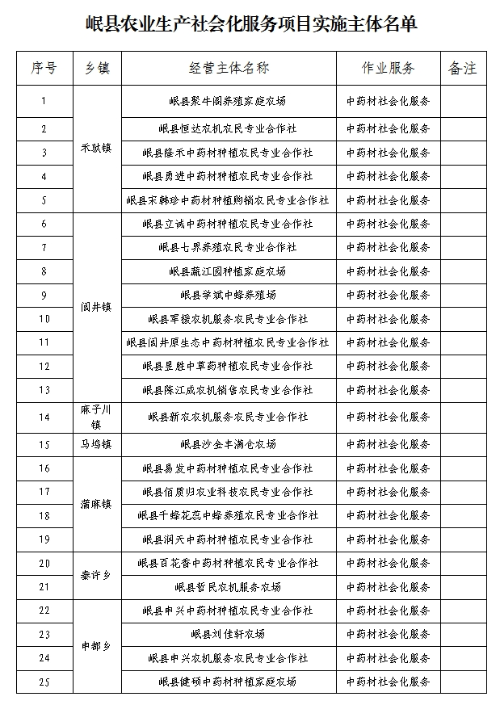 根据岷县2025年农业生产社会化服务项目实施方案要求,按照“公平、公正、公开”的原则,通过经营主体自荐、乡镇推荐、县农机中心与经管站联审,结合2024年经营主体实施项目情况,经研究讨论,确认2025年新申报的岷县嘉盛农机服务农民专业合作社等3家经营主体申报资格真实有效,与2024年实施了农业生产社会化服务项目的33家经营主体共同实施2025年全县农业生产社会化服务项目,现对项目实施经营主体名单进行公示: