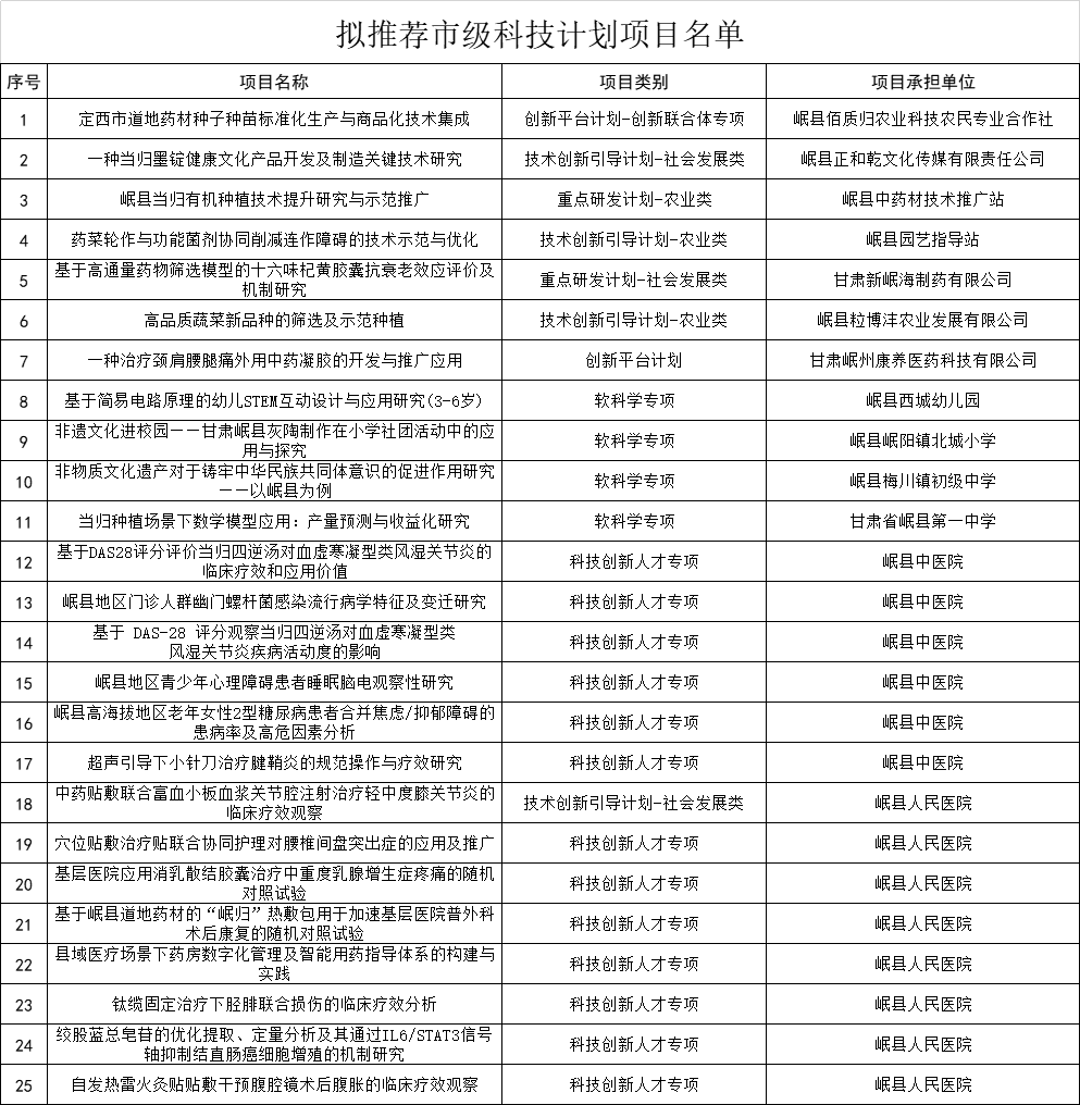 根据《定西市科学技术局关于组织申报2025年度定西市科技计划项目的通知》(定科发〔2025〕12号)要求,县科学技术局积极组织通过开展广泛宣传科技计划项目申报政策,开展针对性指导和接受咨询,积极组织我县企业、科研机构、推广单位、学校、新型研发机构等企事业单位申报2025年度定西市科技计划项目,截止初评时,共受理申报项目34项。4月27日我局组织相关领域技术专家和财务专家对申报项目进行了初评,结合专家意见,确定拟推荐项目25项,现予公示,接受社会监督。 公示时间为2025年4月30日至2025年5月9日,共5个工作日,受理反映时间:每天上午8:30-12:00,下午2:30-6:00。公示期内,如有异议,请以书面方式向我局反映,并提供必要的证据材料,以便核实查证。提出异议者须提供本人真实姓名、工作单位、联系电话等有效联系方式,凡匿名、冒名或超出期限的异议不予受理。 联系电话:0932-5958859 邮 箱:mxkjj@163.com 通讯地址:岷县岷阳镇和平街中路34号 附件:拟推荐市级科技计划项目名单 附件 岷县科学技术局 2025年4月30日