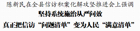 4月17日,县委书记陈新民主持召开全县信访积案化解攻坚推进会。他强调,要深入学习贯彻习近平总书记关于加强和改进人民信访工作的重要思想,全面落实党中央决策部署和省委、市委工作要求,坚持系统施治、从严问效,真正把信访“问题清单”变为人民“满意清单”。